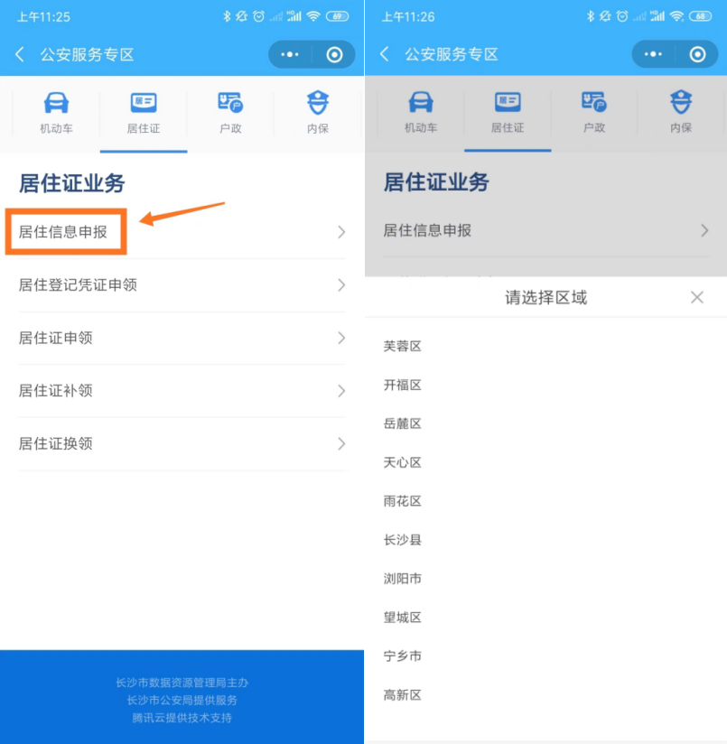 如果您还没进行居住信息申报,请微信搜索“我的长沙”小程序或APP,点击“居住证办理”(先申报后申领),进入“居住信息申报”(提前半年申报),选择您所在的区(县)。(如下图)