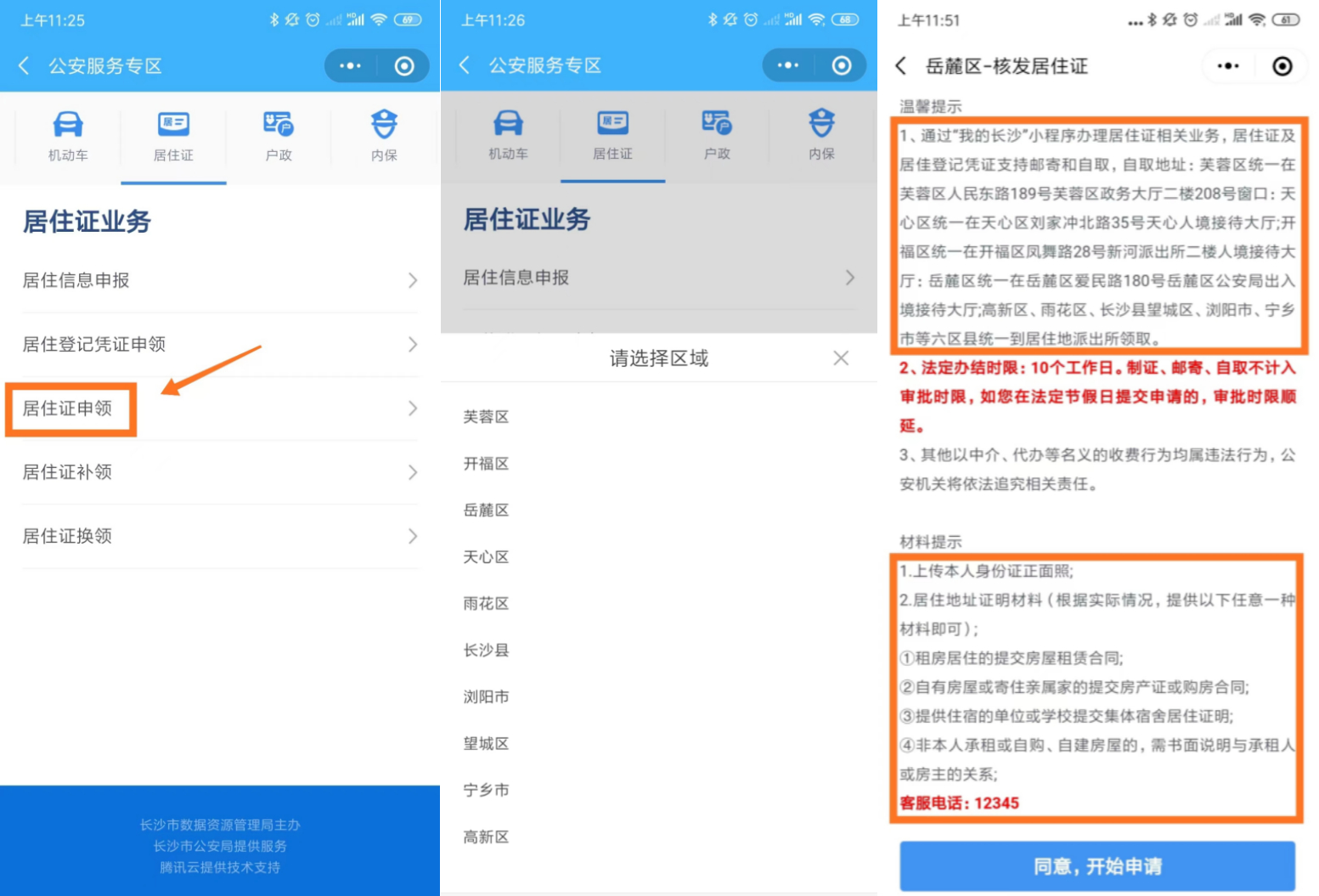 居住信息申报满半年后,准备好上述资料,可以在“我的长沙”小程序,点击“居住证办理”,进入“居住证申领”,选择您所在的区(县)。如下图所示: