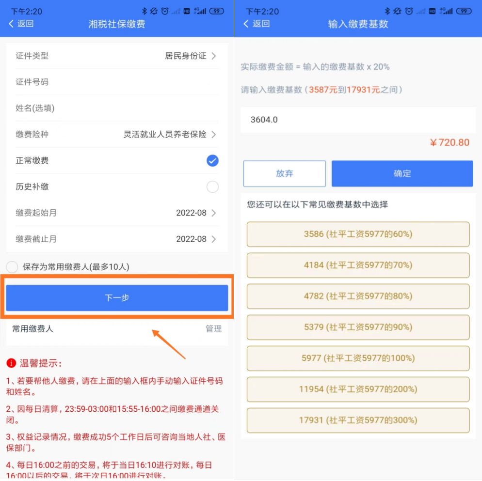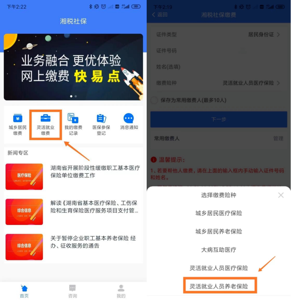 2021年1月1日起,灵活就业人员社会保险费可凭身份证等有效证件到长沙银行、农业银行、建设银行柜面缴纳,或通过上述银行自助终端、网银缴纳。也可通过湘税社保APP及湘税社保微信小程序等网上、掌上渠道缴纳。以“湘税社保”APP为例: