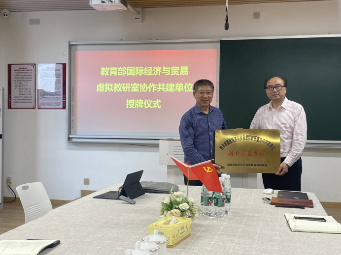崔日明教授向“教育部国际经济与贸易专业虚拟教研室湖南信息学院基地”授牌,并对我校表示祝贺。同时强调要以一流专业和虚拟教研室建设为契机,充分利用线上线下资源,打造一批高水平教学团队,促进教学改革与创新,提升科研成果质量,加强专业内涵建设。