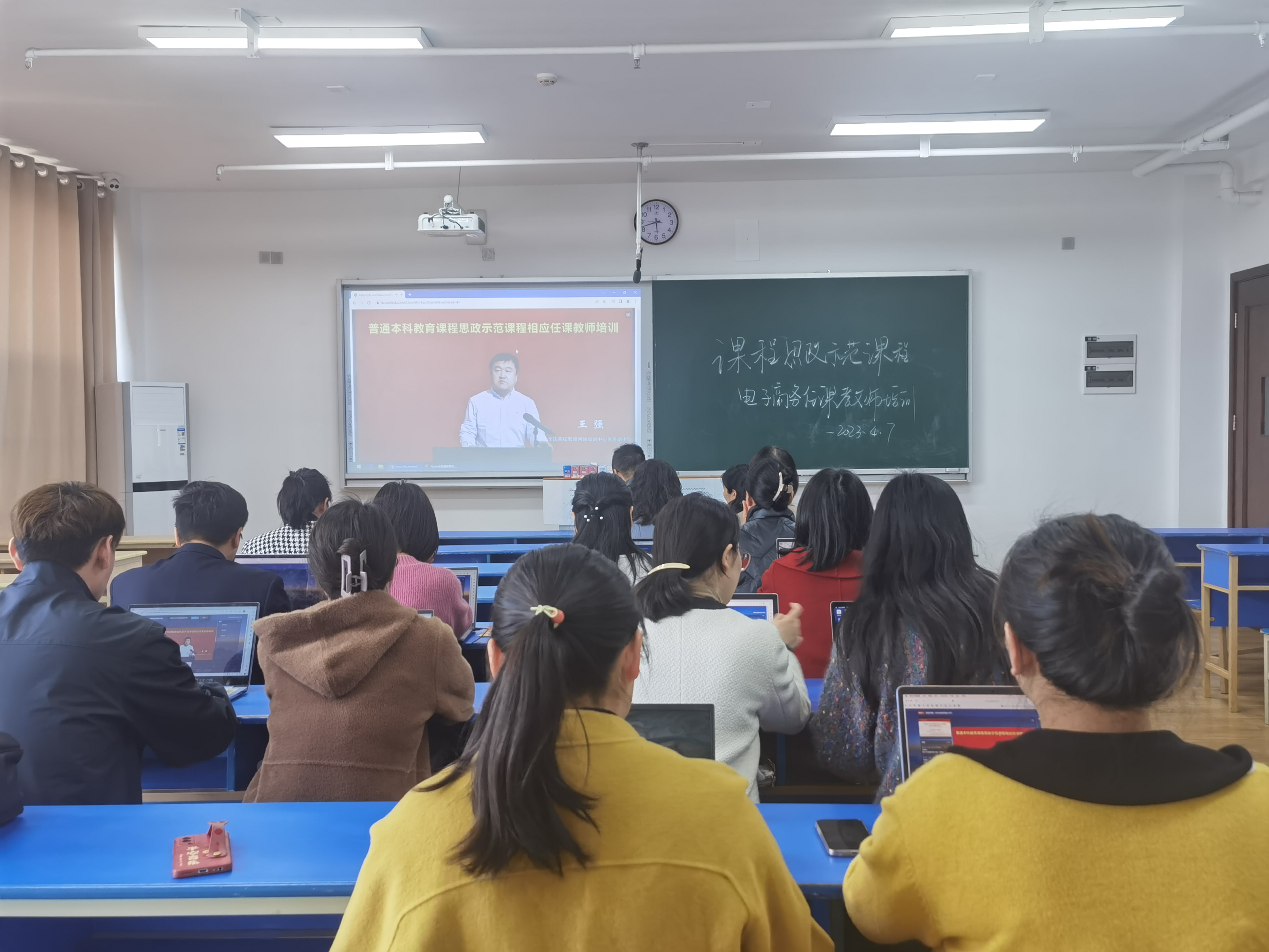 2023年4月7日中午13:30在信息中心楼904教室,湖南信息学院国际商学院电子商务系全体教师在匡益明主任的组织下收看了教育部网培中心组织的《普通本科教育课程思政示范课程相应任课教师培训——电子商务类—网络营销》,国际商学院胡令副院长出席了本次活动。