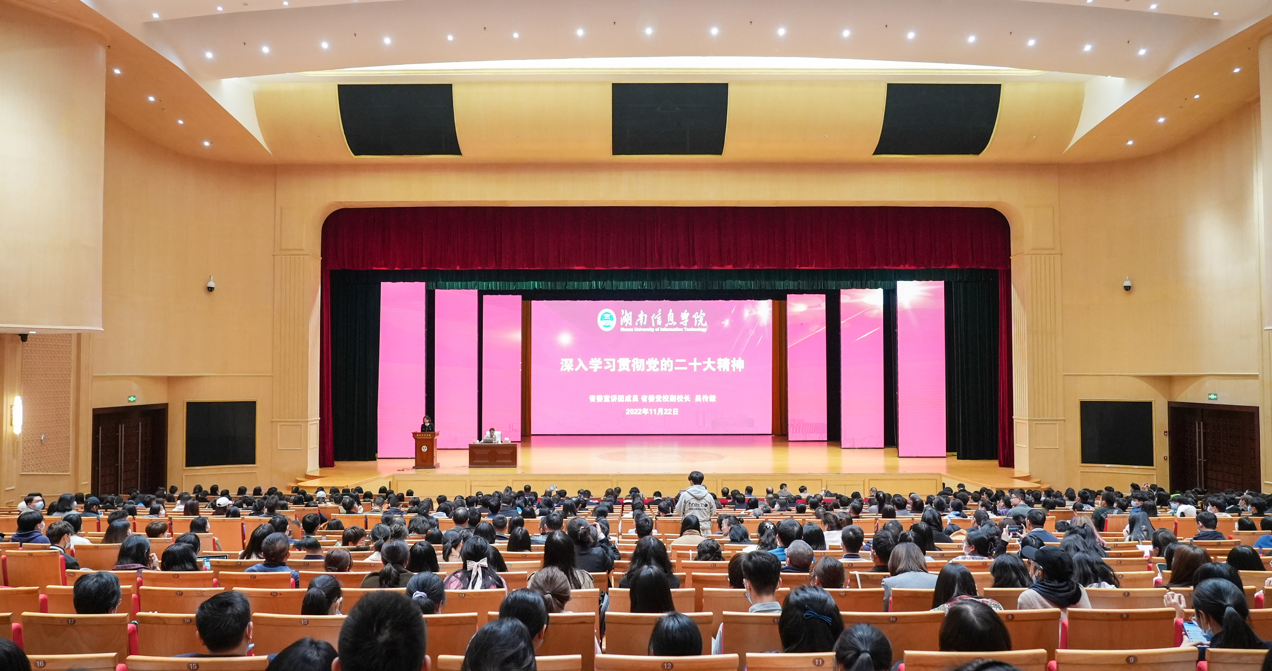 11月22日下午,学校在塘湾湖大剧院举行学习贯彻党的二十大精神省委宣讲团报告会。省委宣讲团成员、中共湖南省委党校副校长、湖南行政学院副院长、国家二级教授吴传毅作宣讲报告。学校董事长陈登斌,校长黎大志,执行校长杨虹,党委副书记姜佐澧,副校长刘龙刚、鄢敦望、尹开源,董事长助理、校长助理,副处级以上干部,教职工代表、学生代表共计900余人聆听报告会。报告会由学校党委书记喻玲娜主持。