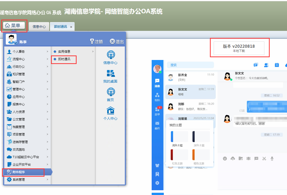 1.下载电脑端的客户端,首先通过电脑浏览器地址栏输入OA地址oa.hnuit.edu.cn,进入网页版OA系统之后在“菜单栏”点“附件程序”中的“即时通讯”及可以下载最新版本的“通达OA”;
