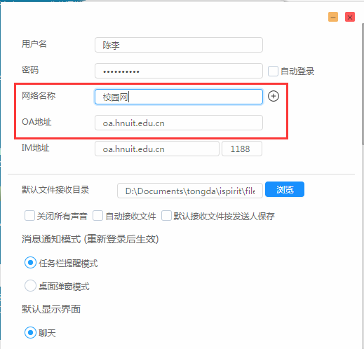 2.在“网络名称中”输入“校园网”,在“OA地址”中输入“oa.hnuit.edu.cn”;