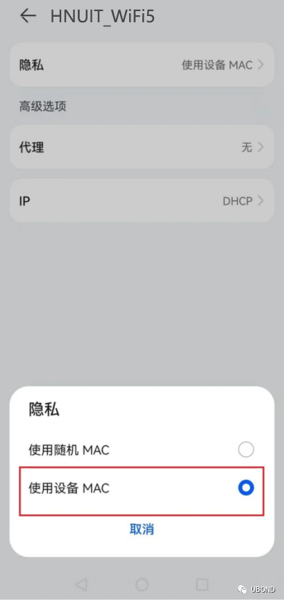 连接HNUIT_WiFi5后,在网络设置中长按HNUIT_WiFi5网络,此时会出现“修改网络”,勾选“显示高级选项”,在隐私里将使用随机MAC改为使用设备MAC,如下图所示: