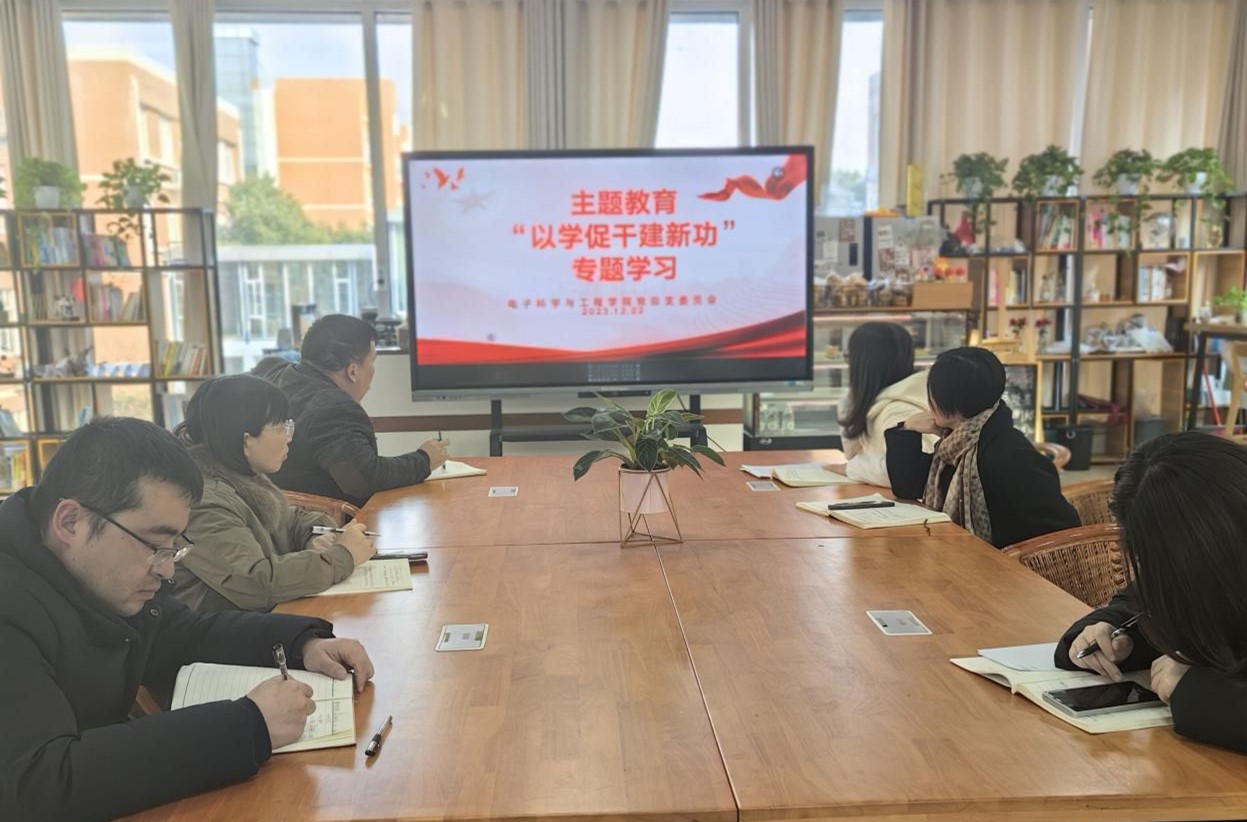 为将学习贯彻习近平新时代中国特色社会主义思想主题教育的学习成果进一步转化为推进学院各项工作的动力,12月22日,电子科学与工程学院党总支在教师活动室组织“以学促干建新功”主题教育专题理论学习。学院党总支成员、学生党支部书记参与此次专题理论学习讨论。