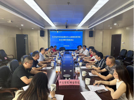 会议在管委会创业服务中心吴信村主任的主持下,学校与中电凯杰科技有限公司、长沙蒲公英智能科技有限公司、湖南米奇人口资源有限公司、湖南深兰创鸿科技有限公司、湖南皓宙智能科技有限公司、长沙泓泽农机服务有限公司、湖南涛峻科技有限公司、湖南全洲伟诚智能技术有限公司、通号工程局集团北京研究设计实验中心有限公司湖南分公司、湖南浔龙河物联网科技有限公司、长沙中达智能科技有限公司、长沙市斯帕克电子科技有限公司、湖南猎瑞人力资源有限公司、湖南思博睿智能装备有限公司等14家企业进行了深入的交流。