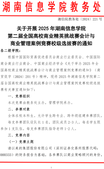 附件:湘信院教务处〔2024〕221号:关于开展2025年湖南信息学院第二届全国高校商业精英挑战赛会计与商业管理案例竞赛校级选拔赛的通知.pdf.zip