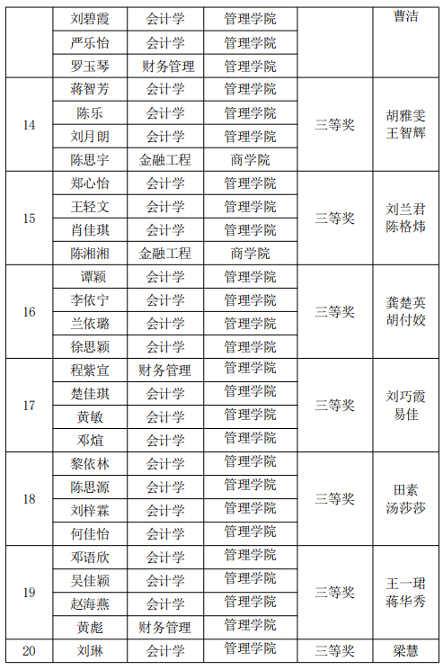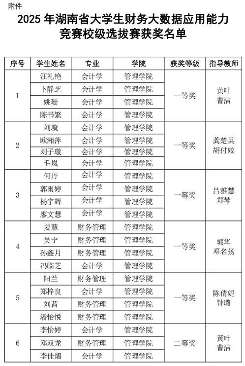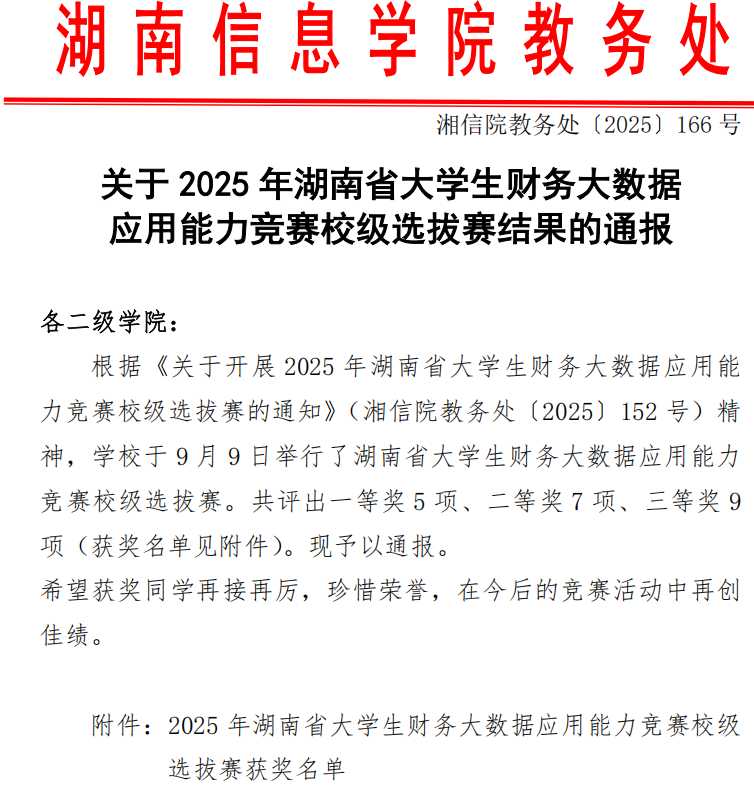 附件:湘信院教务处〔2025〕166号:关于2025年湖南省大学生财务大数据应用能力竞赛校级选拔赛结果的通报.pdf