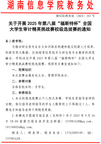 附件:湘信院教务处〔2025〕167号:关于开展2025年第八届“福斯特杯”全国大学生审计精英挑战赛校级选拔赛的通知.zip