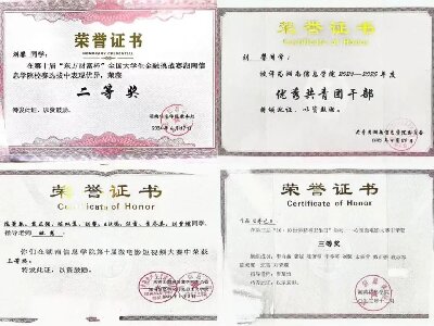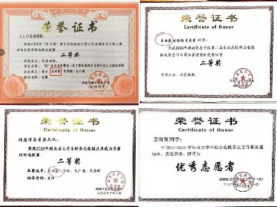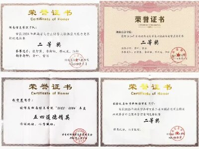 荣获2023年湖南省大学生财务大数据应用能力竞赛校赛二等奖;2023-2024年大学生社会实践学生工作服务基地“优秀志愿者”称号;2024年“福斯特杯”全国大学生审计精英挑战赛校赛二等奖;2024年“正大杯”第十五届全国大学生市场调查与分析大赛校赛二等奖;2025年度湖南信息学院第二届全国高校商业精英挑战赛会计与商业管理案例竞赛校赛二等奖。