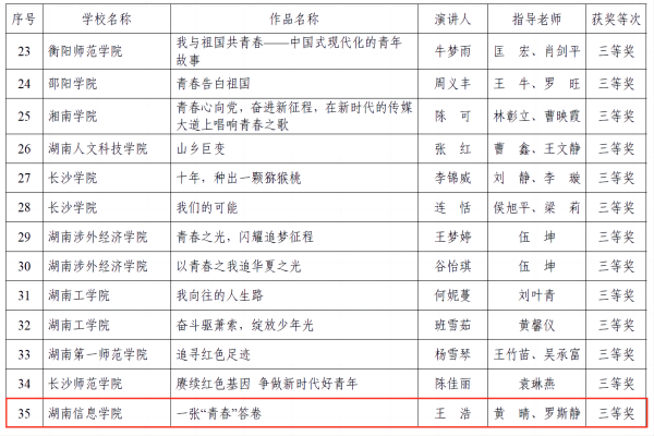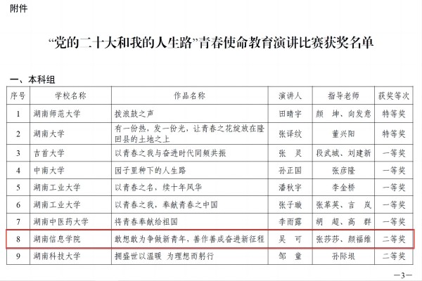 2022年11月,根据省委教育工委统一安排,省教育厅在全省高校组织开展大学生“党的二十大和我的人生路”青春使命教育演讲比赛。此次比赛经过初赛、复赛、决赛三个阶段,经省内各高校组织初赛、湖南工业大学承办复赛和决赛,2023年3月共评选出本科组、高职高专组特等奖各2名、一等奖各5名、二等奖各8名,本科组三等奖20名、高职高专组三等奖30名,优秀组织奖10个。我院颜福维老师与艺术学院张莎莎老师指导的吴可同学荣获二等奖,我院罗斯静副院长与艺术学院黄晴老师指导的王浩同学荣获三等奖。