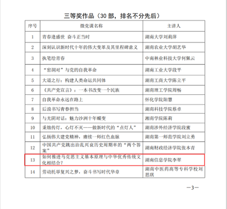 11月中旬,根据省委组织部统一安排,省委教育工委决定在全省高校开展学习宣传贯彻党的二十大精神精品微党课评选交流活动,我院李翠教师代表学校参与精品微党课拍摄及评选,经高校初评、推荐,省委教育工委组织评审,共评选出优秀作品 50 部,李翠教师荣获三等奖。