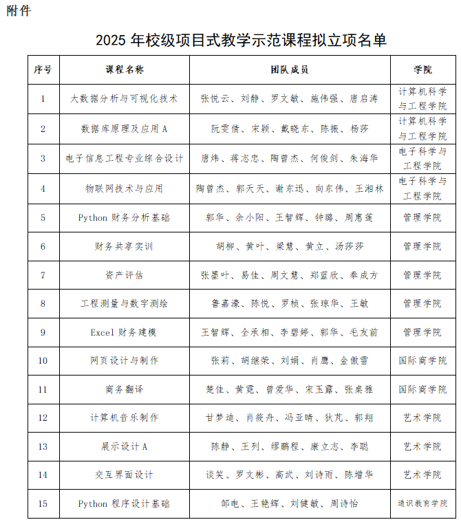 根据《关于开展2025年度项目式教学示范课程相关工作的通知》(湘信院教务处〔2025〕171号)精神,由课程负责人申请,所在部门遴选推荐,教务处组织专家评审,拟立项15门课程为2025年校级项目式教学示范课程(名单见附件),现予以公示。
