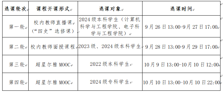 3.校内教师直播课为“四史”(中国共产党历史、改革开放史、社会主义发展史、新中国史)选修课,该类课程为通识教育选修课中的必修课程,学生在校期间必须选修一门。本次主要面向2024级计算机科学与工程学院和电子科学与工程学院的本科学生、2025年专升本编入2023级学生(系统预置,不需选课)开设,每名学生必选且限选一门。