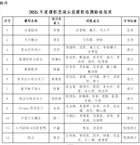 根据《关于开展2025年课程思政示范课程相关工作的通知》(湘信院教务处〔2025〕187号)精神,教务处组织专家对2023年立项的12门课程思政示范课程进行了结题,其中2项评为优秀、8项验收通过、2项暂缓通过,现予以公示。