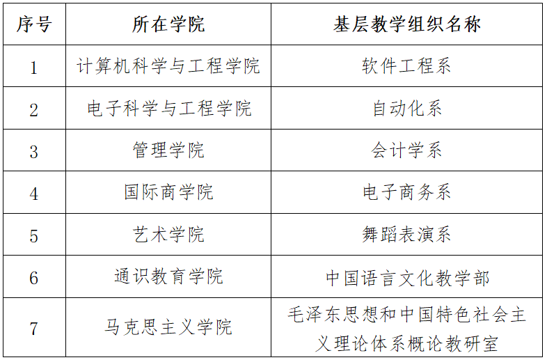 根据教育部《关于深化本科教育教学改革全面提高人才培养质量的意见》(教高〔2019〕6号)精神,以及我校《关于开展2025年度优秀基层教学组织评选工作的通知》(湘信院教务处〔2025〕231号)要求,由基层教学组织申报、各二级学院推荐,经学校审核,共评出优秀基层教学组织7个,现公示如下: