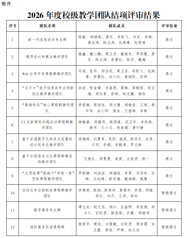 根据《关于开展2026年度校级教学团队结项验收工作的通知》(湘信院教务处〔2025〕238号)精神,由团队负责人申请,所在部门初审,教务处组织专家评审,对12个2022年度立项的教学团队进行了结项验收,现予以公示。