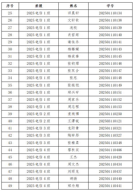 根据《关于开展湖南信息学院第六届“电子信息工程卓越工程师班”选拔工作的通知》(湘信院教务处〔2025〕242号)文件,学校面向2025级电子信息工程专业学生组织开展了第六届“电子信息工程卓越工程师班”学员选拔工作。经学生自愿报名、学院资格审核及面试、学校复核,最终录取49名学生为“电子信息工程卓越工程师班”学员,现将名单(见附件)予以公布。