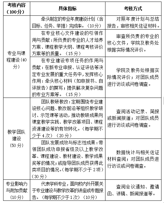 (2)重点考核其在专业建设、课程建设、教学团队建设等方面的实际成效。