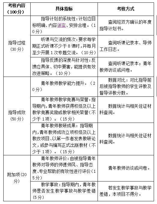 (2)重点考核指导过程的规范性(含计划的系统性、听课与交流的频次与深度)以及被指导青年教师的成长成效(主要体现在课堂教学能力提升与教研教改成果等方面)。