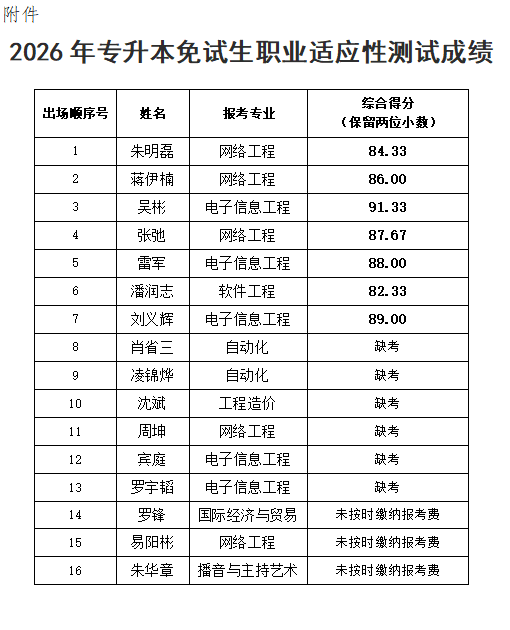 附件:2026年专升本免试生职业适应性测试成绩
